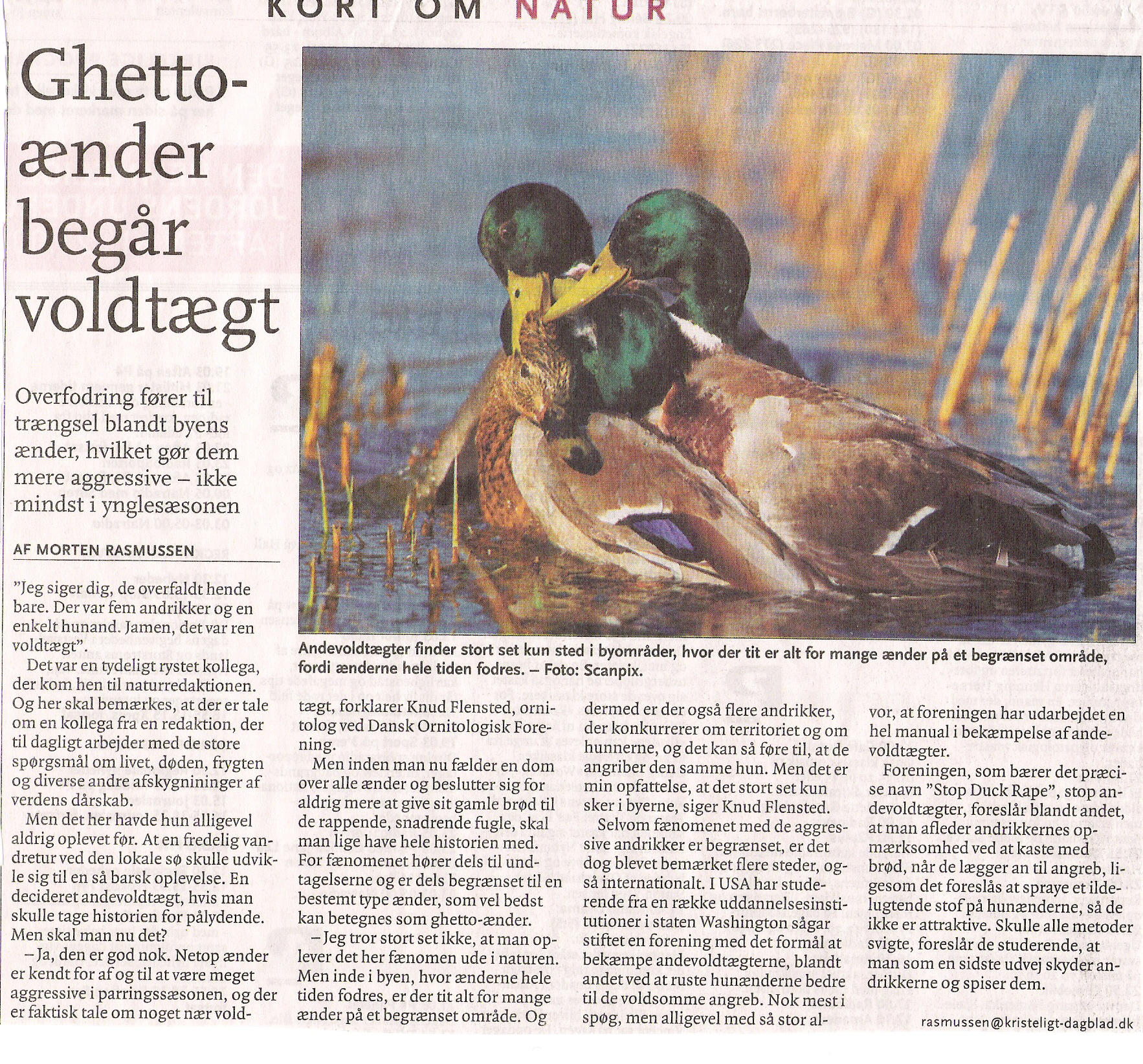 Jeg lagde for nogen tid siden mærke til den lille notits om andevoldtægt, der var at læse i Kristeligt Dagblad for nylig. Den fortæller jo faktisk lidt om noget der måske kunne ses som en slags parallel, her bare i fuglenes verden.